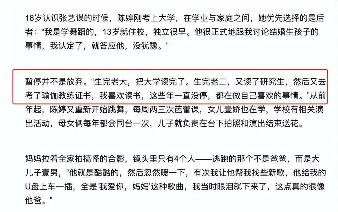事实上,陈婷并非依附丈夫的菟丝花,也没有彻底躺平,而是在婚姻中不断独立成长。她在采访中提及,自己从未放弃读书,生完大儿子后完成了大学学业,生下二儿子后又考取了研究生,跳舞、瑜伽、演出等爱好也始终坚持,从未因家庭放弃自我提升。当年她跟随张艺谋出席巴黎名媛舞会时,一袭黑裙优雅贵气,在国际名利场上从容得体、应对自如,反倒让张艺谋退居身后,尽显端庄大气。