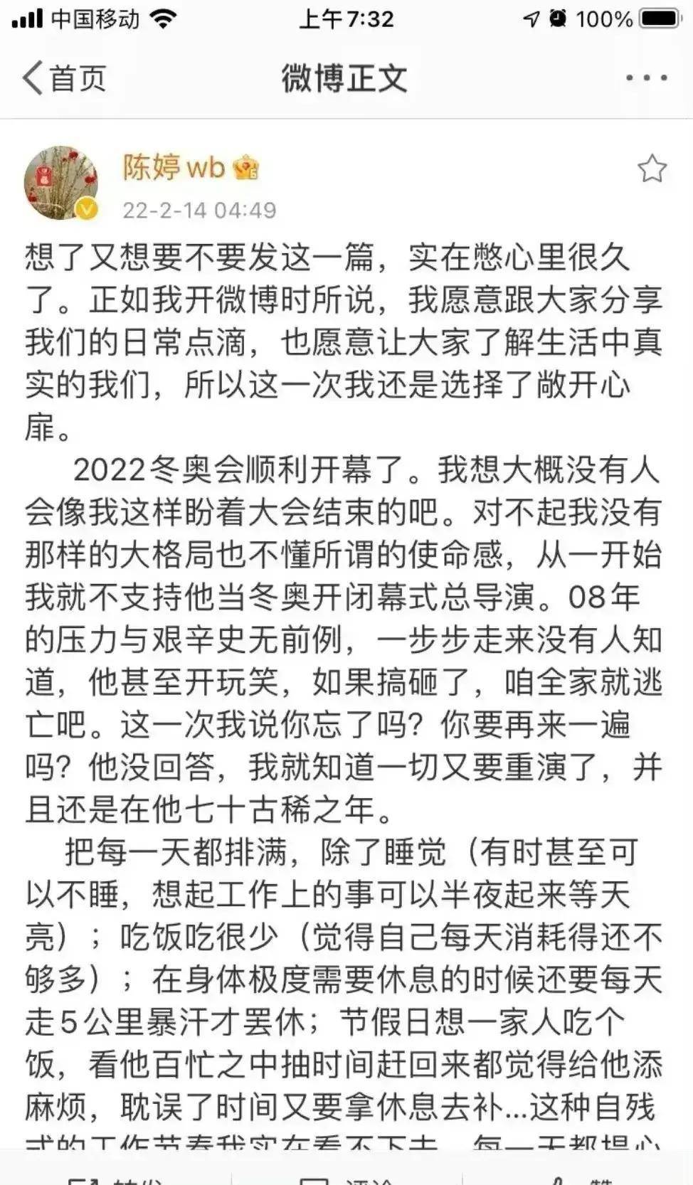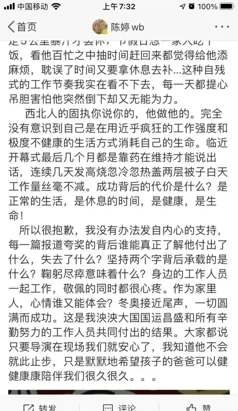 后来陈婷渐渐减少社交平台更新,淡出公众视野,起因年的一则小作文风波。当时北京冬奥会筹备正紧,已是古稀之年的张艺谋没日没夜坚守在工作一线,作为妻子的陈婷心疼不已,便在社交平台发布了一段真情实感的文字,字里行间满是对丈夫身体的担忧,只盼着他能健健康康,多陪自己和四个孩子几年。可这番朴实的牵挂,却被网友指责格局太小,沦为“保姆式婚姻”的吐槽对象,刻薄的舆论瞬间将她包围,让她陷入争议之中。